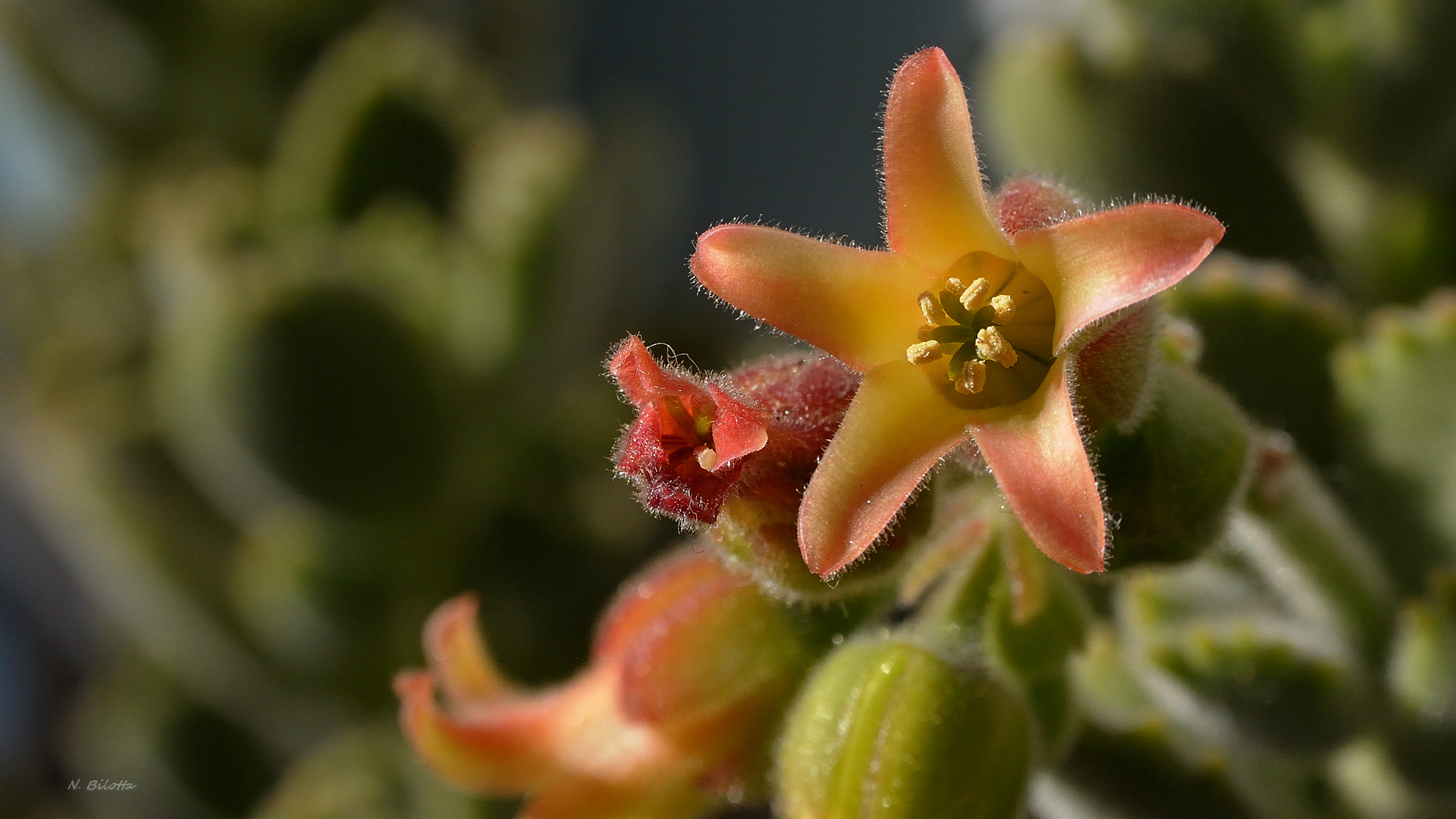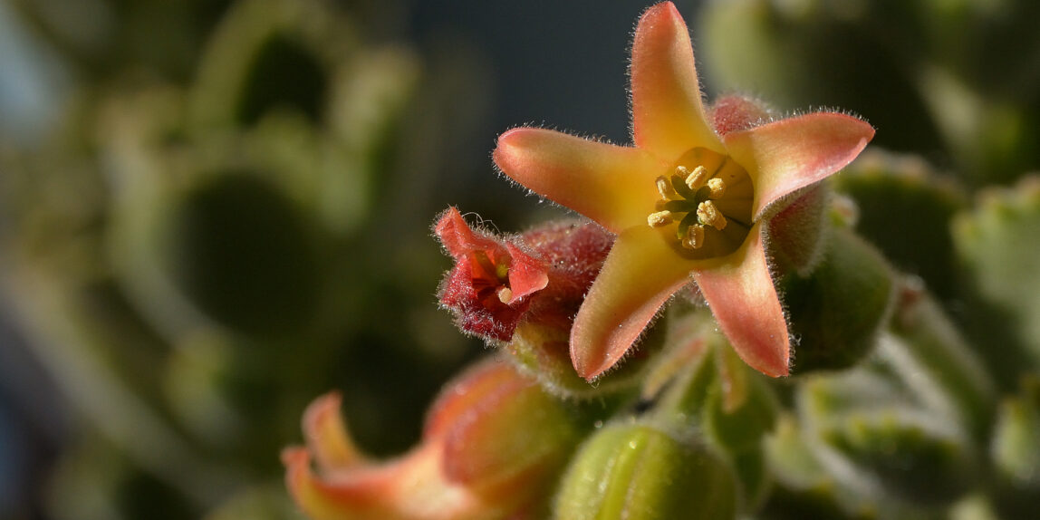 Se ci si sforza di vedere, una semplice piantina del balcone di casa può riservarci qualche piacevole sorpresa rivelandoci un mondo inaspettato. E’ il caso di questa pianta grassa con i suoi delicati fiorellini arancione che a prima vista passano quasi inosservati.